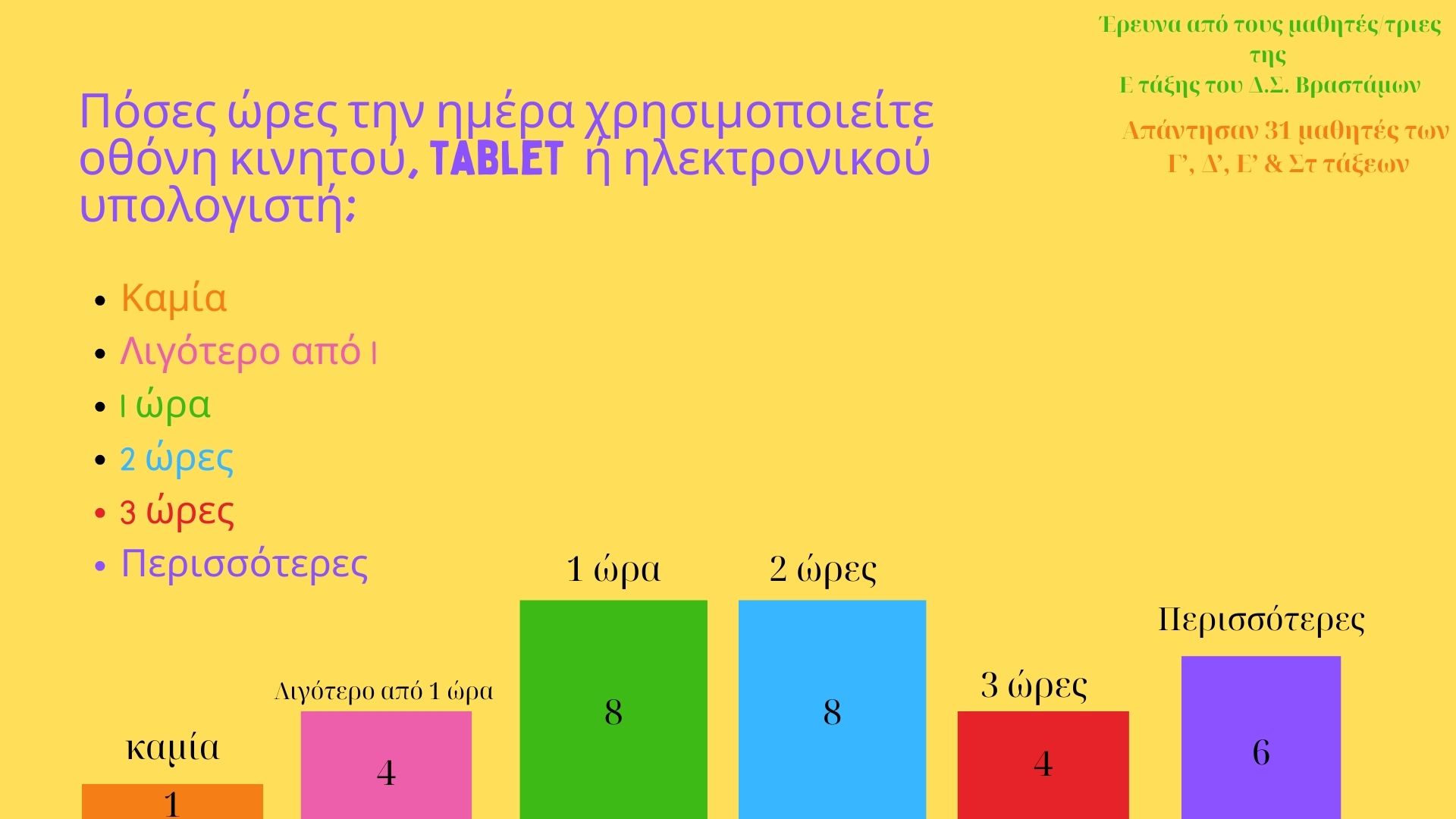 20 Φεβρουαρίου 202620 Φεβρουαρίου 2026 Δημοτικό Σχολείο Βραστάμων Οι μαθητές/ τριες της Ε τάξης του σχολείου μας στα πλαίσια της διδασκαλίας των Μαθηματικών, προχώρησαν στη διατύπωση ερωτήματος, τη συλλογή, την οργάνωση και την αναπαράσταση των δεδομένων. Σας παρουσιάζουμε τα αποτελέσματα! Related posts:ΤΕΛΕΣΗ ΤΟΥ ΑΓΙΑΣΜΟΥ ΣΤΟ ΔΗΜΟΤΙΚΟ ΣΧΟΛΕΙΟ ΒΡΑΣΤΑΜΩΝΑΝΤΙΚΑΠΝΙΚΟΣ ΝΟΜΟΣΣυνάντηση γονέων και κηδεμόνων της Γ΄τάξης.Spread the love