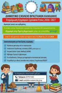 ΕΓΓΡΑΦΕΣ ΣΤΗΝ Α ΔΗΜΟΤΙΚΟΥ ΓΙΑ ΤΟ ΣΧΟΛΙΚΟ ΕΤΟΣ 2026-2027